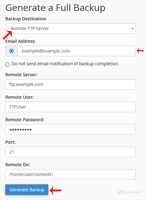 5. Once you fill in the Remote FTP details, click on Generate Backup.