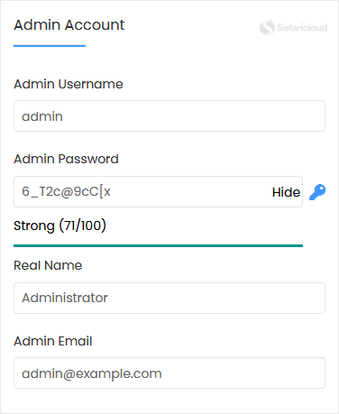 7. Under the Admin Account field, enter the following information: