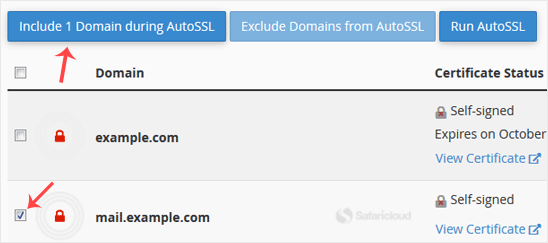 3. Under Domain, choose the domain you want to include. Then click on "Include x domain(s) during AutoSSL". Selected domains/sub-domains will be included in AutoSSL.