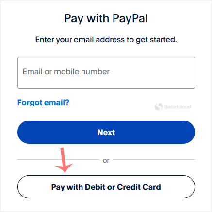You can pay without having a PayPal Account by using a Debit or Credit Card.